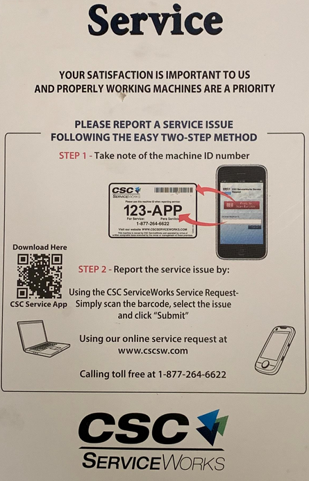 Maintenance of the machines is managed by a third-party. Contact 877-264-6622 for service.